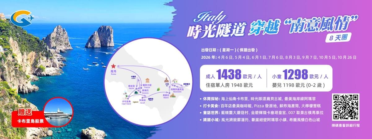 - 接駁方案:Gtour (意大利南部) 通過接送服務,可接駁(GoEuGo綠線 羅馬酒店)及Gtour(瑞士團)。預訂「意大利南部團」時,可以考慮加入旅遊計劃!查詢 info@gegeu.com