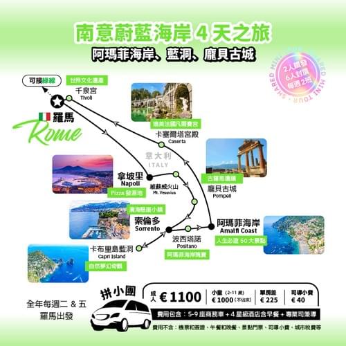 • 人氣景點:卡布里島藍洞 (自然夢幻奇觀)、阿瑪菲海岸 (人生必遊50大景點)、波西塔諾 (阿瑪菲海岸瑰寶)
