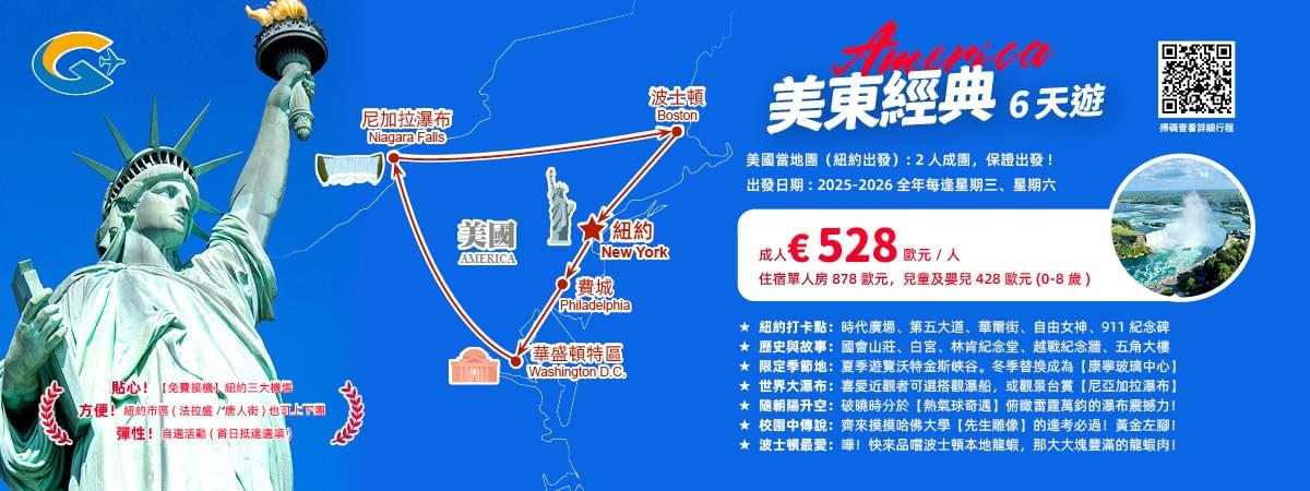 注意事項:美東經典6天遊“行程順序”可能會應參團日期,而調整前後,但“行程內容”不會減少!